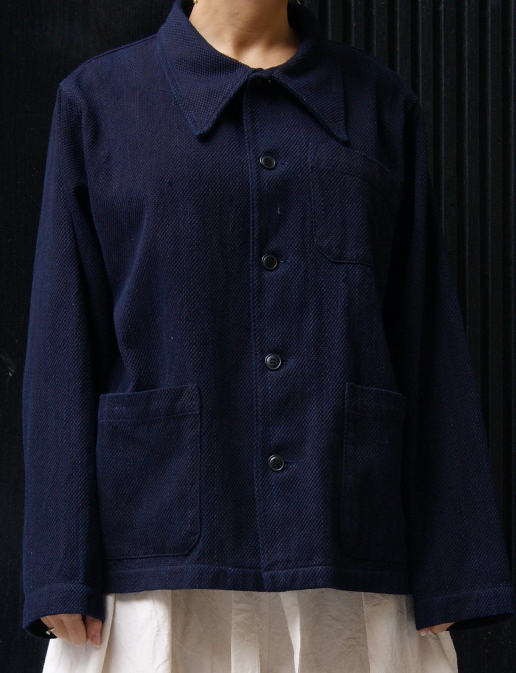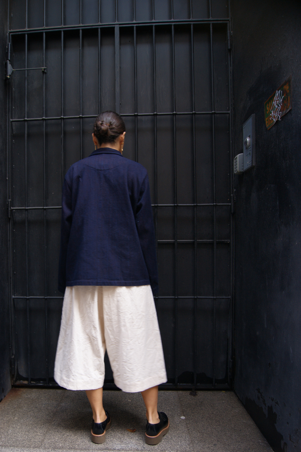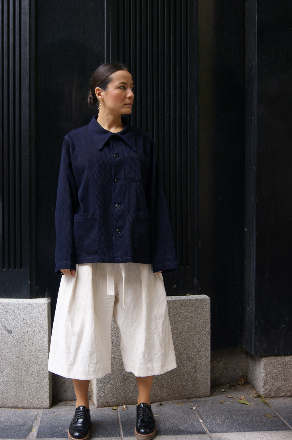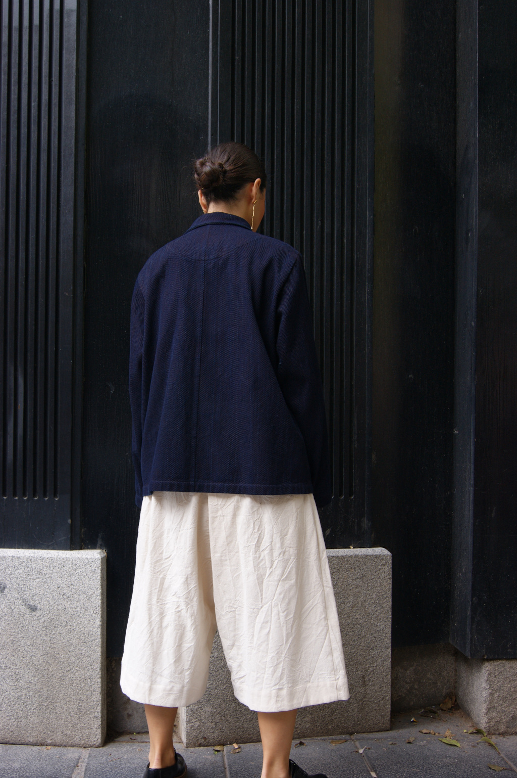 Tiempo y esfuerzo. Es lo que merece este tejido sashiko tradicional japonés. Una tela de algodón gruesa y duradera decorada con costuras de hilo decorativas para fortalecer la tela y mantenerla abrigada. Una tela resistente, fuerte y duradera, que se ha utilizado desde la época Edo. El proceso requiere tanto tiempo que no se puede resumir simplemente. El proceso comienza colocando los hilos en el telar, y ajustando la máquina según la temperatura y humedad del momento, se dice que solo se puede tejer alrededor de 1 metro en una hora. Esta textura suave y confortable es el resultado de las manos y los ojos del artesano cultivados durante muchos años. Si miras de cerca la superficie de la tela, hay áreas oscuras y áreas delgadas. Una de las cosas que hace posible este tipo de apariencia es que está teñido de índigo. Cuando el índigo entra en contacto con el aire, se oxida y adquiere un color índigo. El método de teñido de madejas implica teñir y aflojar repetidamente a mano. Y puedes teñir el hilo hasta el centro. Tanto las irregularidades que sólo se pueden conseguir con el trabajo manual como la característica del teñido índigo, que se vuelve índigo cuando se expone al aire, son absolutamente esenciales. Además, el proceso de lavado resalta el sombreado y, combinado con los desniveles, crea una sensación de aún más profundidad. Tiene un color profundo que parece haber sido usado.